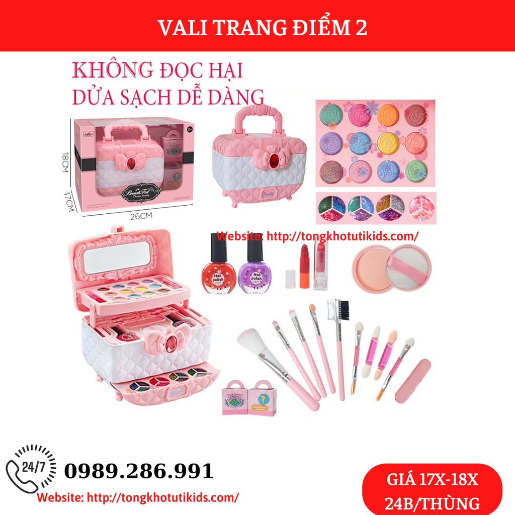 ✔ Hộp trang điểm cho bé có đẩy đủ đồ Make-up: 2 thỏi son, 2 lọ sơn móng tay, Bộ cọ 9 món, gương soi quý phái, cùng bảng phấn màu, màu nhũ lấp lánh trang điểm thật, chất liệu an toàn, dễ làm sạch... kích thích trí tưởng tượng của bé, tất cả được đựng trong chiếc túi máy ảnh xách tay gọn gàng