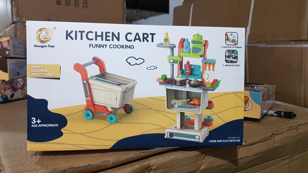 Thiết kế mô phỏng thực tế: Xe đẩy có thiết kế giống một bếp nấu ăn di động với các chi tiết như bếp ga, lò vi sóng, bồn rửa chén, và các dụng cụ nấu ăn.